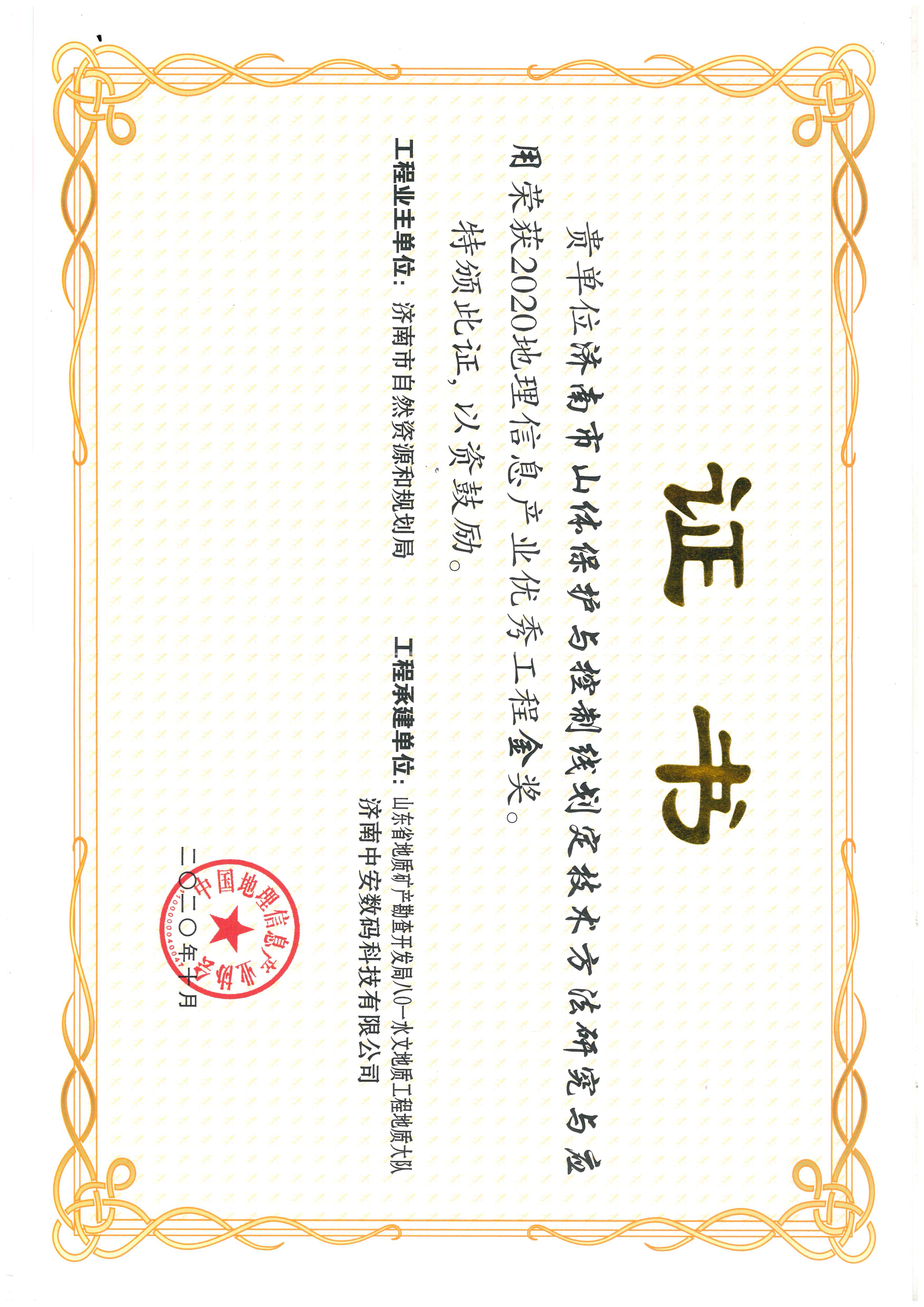 2020年優(yōu)秀工程金獎 地理信息科技進步獎證書